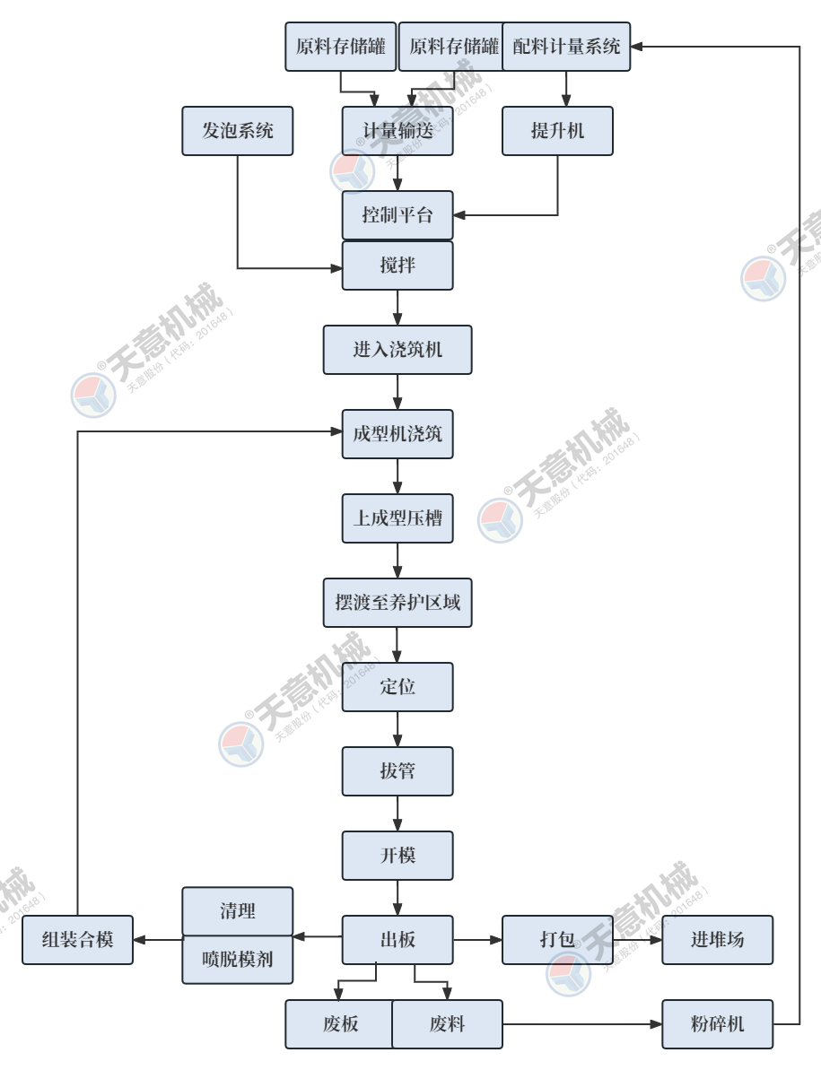 9.生產(chǎn)線設(shè)有封閉式自動(dòng)噴灑脫模劑裝置(減少了人工現(xiàn)場(chǎng)噴灑作業(yè)及脫模劑的浪費(fèi),生產(chǎn)觀場(chǎng)更加節(jié)約環(huán)保)。